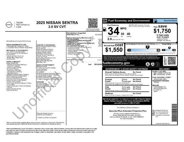 Located halfway between Dallas, and Oklahoma City, Woody Ford has been in Madill, OK since 1920. We are just 20 miles east of Ardmore, and 30 miles west of Durant. Let us make buying a new or used vehicle a hassle-free experience. Always here to serve, that's the Woody Ford way! Open 24/7/365 at www.woodyford.com Woody Ford Madill is excited to offer this good-looking 2025 Nissan Sentra SV in Aspen White Tricoat with Charcoal interior well equipped with All-Weather Package (Dual Zone Auto Climate Control, Heated Exterior Mirrors, Heated Front Seats, Leather-Wrapped Heated Steering Wheel, and Remote Engine Start), 16" Alloy Wheels, 4-Wheel Disc Brakes, 8 Speakers, ABS brakes, Air Conditioning, Alloy wheels, AM/FM radio: SiriusXM, Auto High-beam Headlights, Blind Spot Warning, Body Colored Splash Guards (4-Piece), Brake assist, Bumpers: body-color, Carpeted Floor Mats with Trunk Mat, Clear Rear Bumper Protector, Delay-off headlights, Door Sill Plates, Driver door bin, Driver vanity mirror, Dual front impact airbags, Dual front side impact airbags, Electronic Stability Control, Four wheel independent suspension, Front anti-roll bar, Front Bucket Seats, Front Center Armrest, Front reading lights, Fully automatic headlights, Illuminated entry, Knee airbag, Low tire pressure warning, NissanConnect featuring Apple CarPlay and Android Auto, Occupant sensing airbag, Outside temperature display, Overhead airbag, Overhead console, Panic alarm, Passenger door bin, Passenger vanity mirror, Power door mirrors, Power steering, Power windows, Premium Paint, Radio data system, Radio: AM/FM with RDS/MP3/Aux-in, Rear anti-roll bar, Rear Parking Sensors, Rear side impact airbag, Rear window defroster, Remote keyless entry, Security system, Speed control, Speed-sensing steering, Split folding rear seat, Steering wheel mounted audio controls, Tachometer, Telescoping steering wheel, Tilt steering wheel, Traction control, Trip computer, Upgraded Cloth Seat Trim, and Variably intermittent wipers.